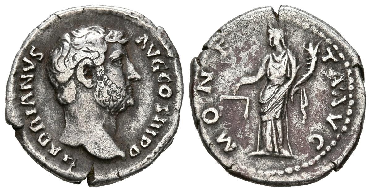 ADRIANO. Denario. (Ar. 3,27g/18mm). 136 d.C. Roma. (RIC 2224). Anv: Cabeza de Adriano a derecha, alrededor leyenda: HADRIANVS AVG COS III P P. Rev: Moneta estante a izquierda portando escala y cornucopia, alrededor leyenda: MONETA AVG. MBC.