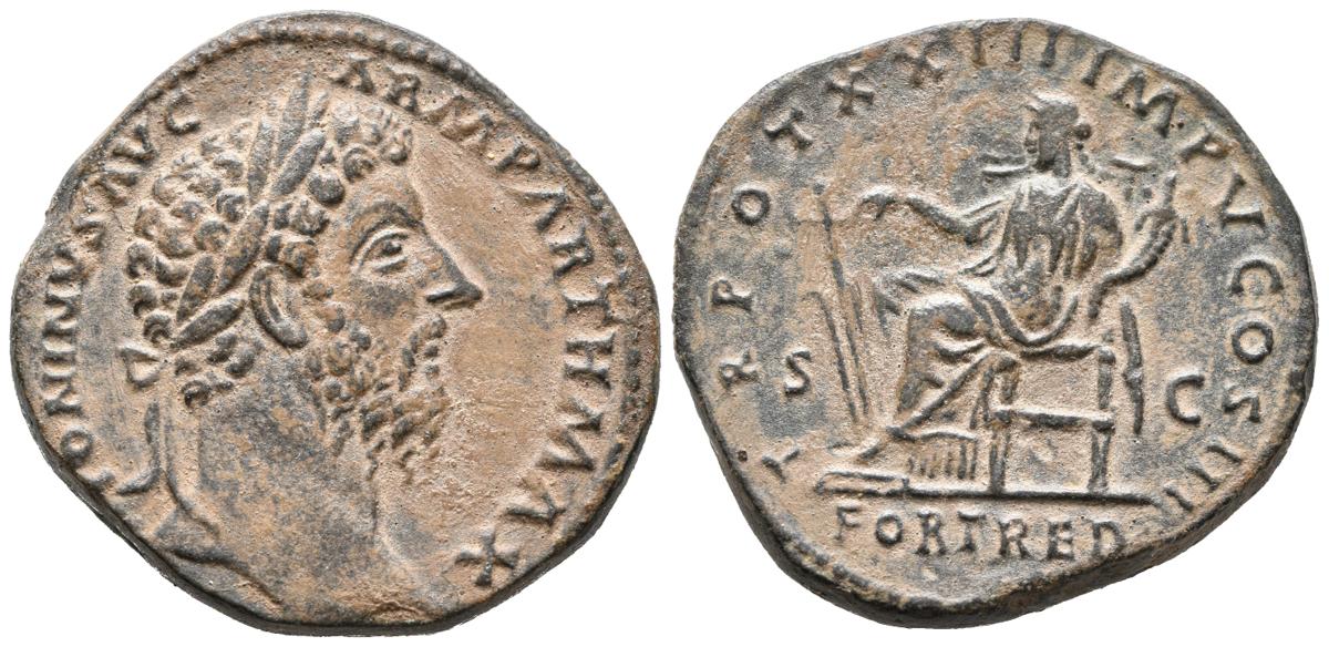 MARCO AURELIO. Sestercio. (Ae. 22,83g/31mm). 167-168 d.C. Roma. (RIC 962). Anv: Cabeza laureada de Marco Aurelio a derecha, alrededor leyenda: M ANTONINVS AVG ARM PARTH MAX. Rev: Fortuna sentada a izquierda portando timón y cornucopia, entre: S-C, en exergo: FORT RED, alrededor leyenda: TR POT XXIII IMP V COS III. EBC.
