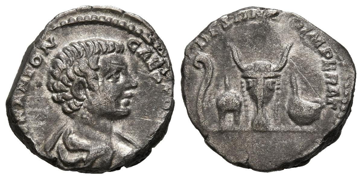 CARACALLA. Denario. (Ar. 2,81g/17mm). 197-198 d.C. Roma. (RIC 6). Anv: Busto drapeado de Caracalla a derecha, alrededor leyenda: M AVR ANTON PONTIF. Rev: Lítuo, apex, bucráneo y símpulo, alrededor leyenda: DESTINATO IMPERAT. MBC.
