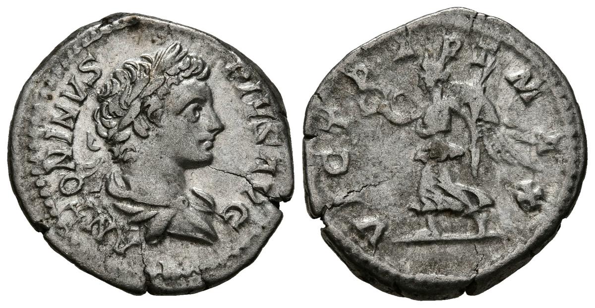 CARACALLA. Denario. (Ar. 3,18g/19mm). 202 d.C. Roma. (RIC 144b). Anv: Busto laureado, drapeado y con coraza a derecha, alrededor leyenda: ANTONINVS PIVS AVG. Rev: Victoria avanzando a izquierda portando corona de laurel y palma, alrededor leyenda: VICT PART MAX. MBC+/MBC.