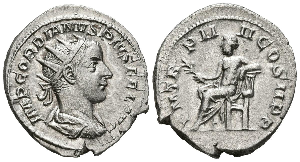 GORDIANO III. Antoniniano. (Ar. 3,51g/23mm). 241 d.C. Roma. (RIC 88). Anv: Busto radiado y drapeado de Gordiano III a derecha, alrededor leyenda: IMP GORDIANVS PIVS FEL AVG. Rev: Apolo sentado a izquierda portando rama, alrededor leyenda: P M TR P IIII COS II P P. MBC+.