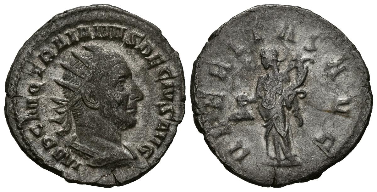 TRAJANO DECIO. Antoniniano. (Ar. 3,38g/22mm). 249-251 d.C. Roma. (RIC 28b). Anv: Busto radiado y con coraza de Trajano Decio a derecha, alrededor leyenda: IMP C M Q TRAIANVS DECIVS AVG. Rev: Uberitas estante a izquierda portando bolsa y cornucopia, alrededor leyenda: VBERITAS AVG. MBC.