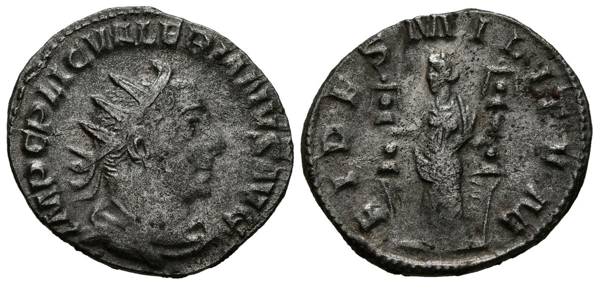 VALERIANO I. Antoniniano. (Ve. 2,77g/21mm). 253-254 d.C. Roma. (RIC 89). Anv: Busto radiado, drapeado y con coraza de Valeriano I a derecha, alrededor leyenda: IMP C P LIC VALERIANVS AVG. Rev: Fides estante a izquierda portando dos estandartes, alrededor leyenda: FIDES MILITVM. MBC.