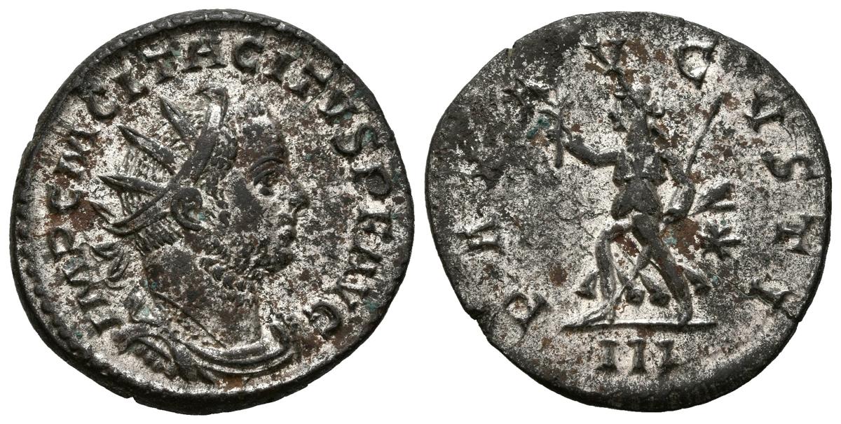 TACITO. Antoniniano. (Ve. 3,38g/21mm). 276 d.C Lugdunum. (RIC 43). Anv: Busto radiado, drapeado y con coraza de Tacito a derecha, alrededor leyenda: IMP C M CL TACITVS P F AVG. Rev: Pax avanzando a izquierda portando rama y cetro, en campo estrella, en exergo: III, alrededor leyenda: PAX AVGVSTI. EBC. Restos de plateado original. Bonito ejemplar.