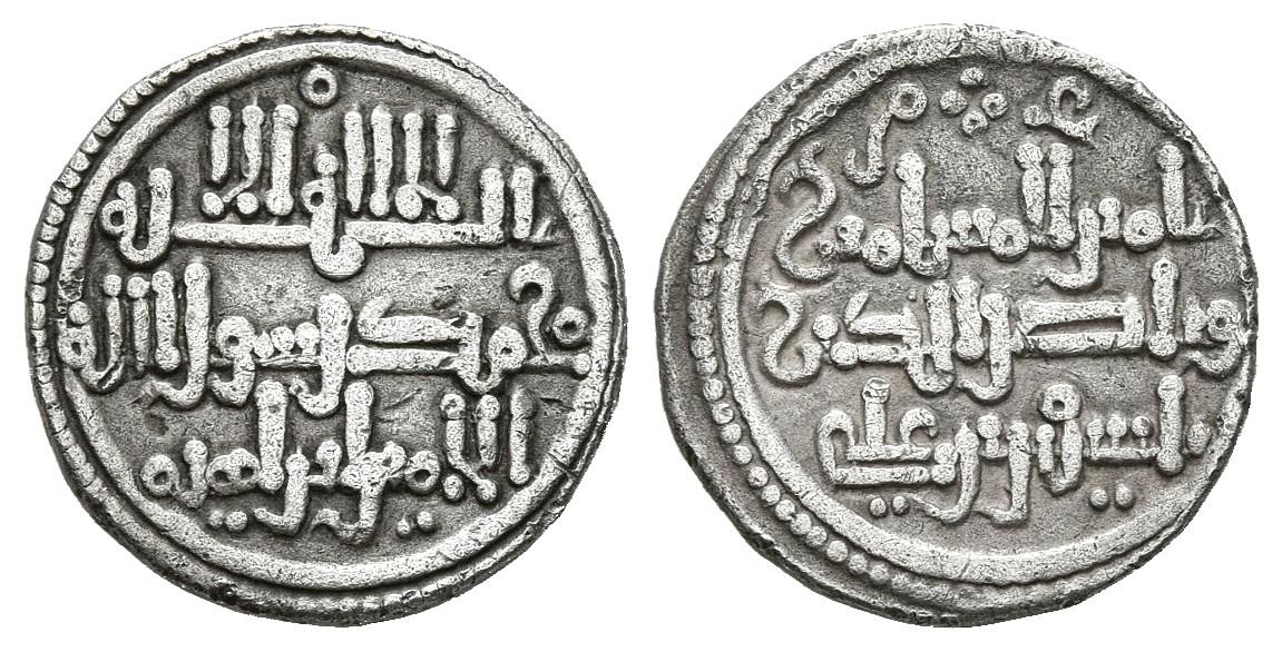 ALMORAVIDES, Tasfin ibn Ali con el emir Ibrahim (539-540H). Quirate.(Ar. 0,91g/12mm). (Vives 1885; Hazard 1035; Benito Db2). MBC.