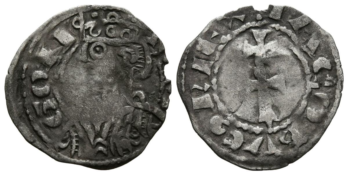 JAIME I (1213-1276). Obolo. (Ve. 0,35g/15mm). Aragón. (Cru V.S. 319). Anv: Efigie coronada a izquierda, alrededor leyenda: ARAGON. Rev: Cruz patriarcal, alrededor leyenda: IACOBVS REX. MBC.