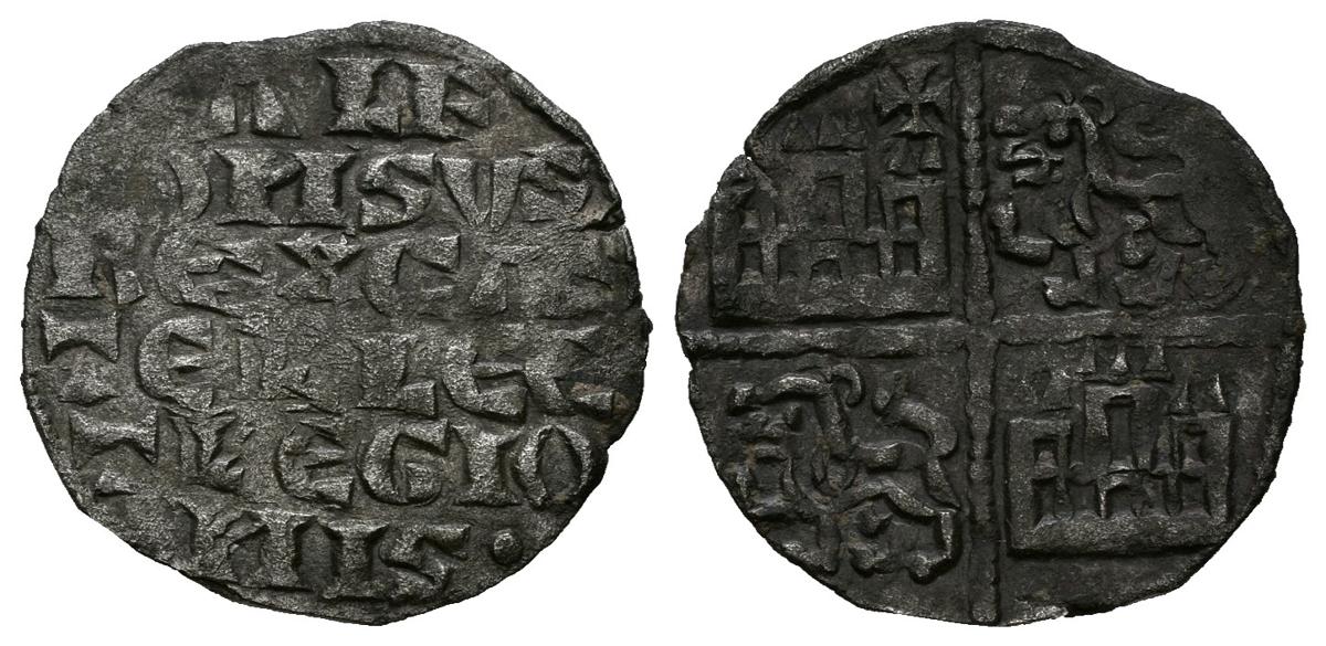 ALFONSO X (1252-1284). Dinero (Ve. 0,80g/17mm). S/D. Marca de ceca Cruz. (FAB-235). Anv: leyenda en seis líneas: ALFONSVS REX CASTELLE ET LEGIONIS; Rev: cuartelado de castillos y leones con cruz potenzada en primer cuadrante. MBC+.