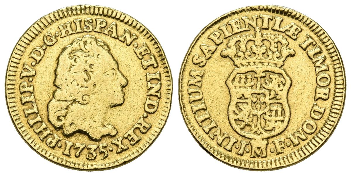 FELIPE V (1700-1746). 1 Escudo. (Au. 3,29g/18mm). 1735. Madrid JF. (Cal-2019-1714). BC+. Usada como joya.