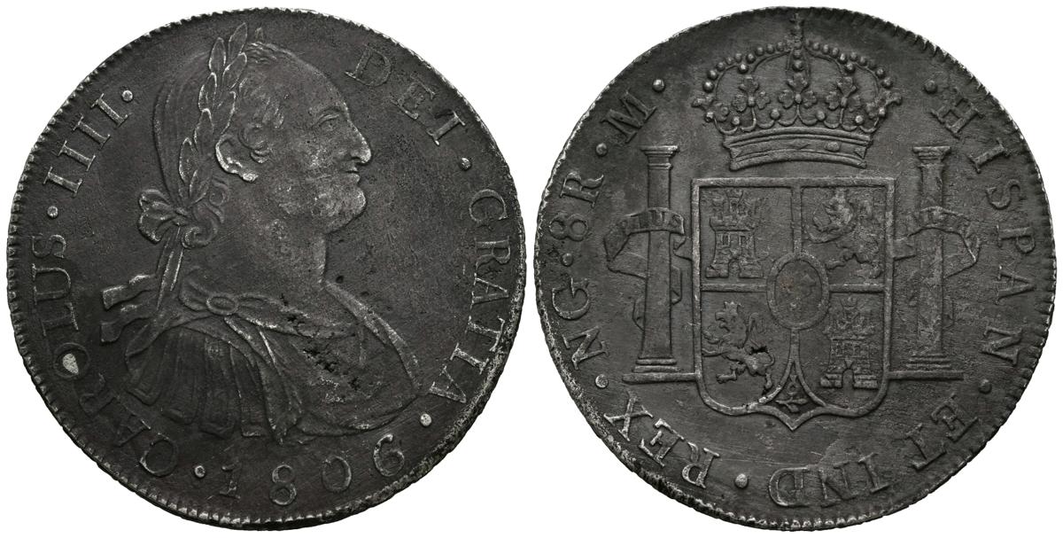 CARLOS IV. 8 Reales. 1806. Guatemala M. Cal-639. Ar. 26,39g. Pátina gruesa oscura. MBC+/MBC. Escasa.