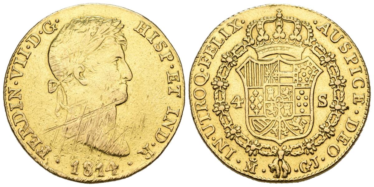 FERNANDO VII (1808-1833). 4 Escudos. (Au. 13,40g/28mm). 1814. Madrid GJ. (Cal-2019-1709). MBC-. Rayas en anverso. Probablemente usada como joya.