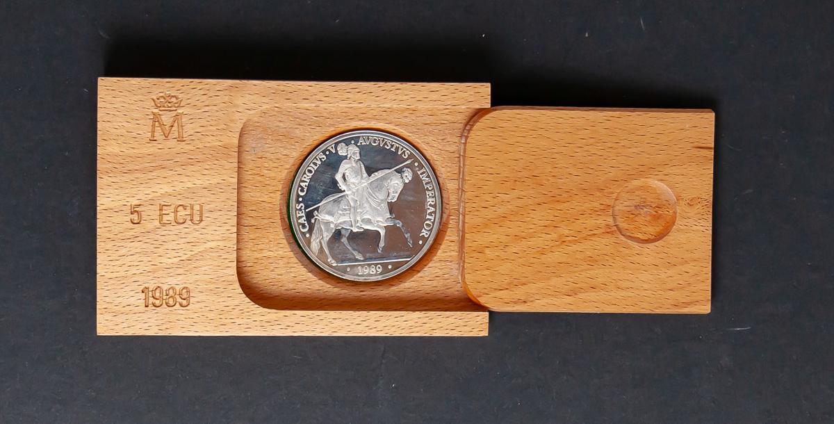 JUAN CARLOS I (1975-2014). 5 Ecu. (Ar. 33,62g/42mm). 1989. FNMT. Madrid. Carlos V. PROOF. Incluye estuche original. Tirada de 250 mil unidades.El importe de la liquidación de este lote irá destinado a Manos Unidas.