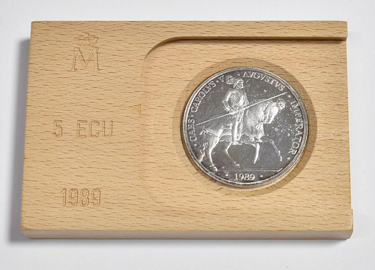 JUAN CARLOS I (1975-2014). 5 Ecu (Ar .33,62g/42mm). 1989. FNMT. Carlos V. Flor de cuño. 250.000 acuñaciones. Incluye estuche oficial y certificado de autenticidad