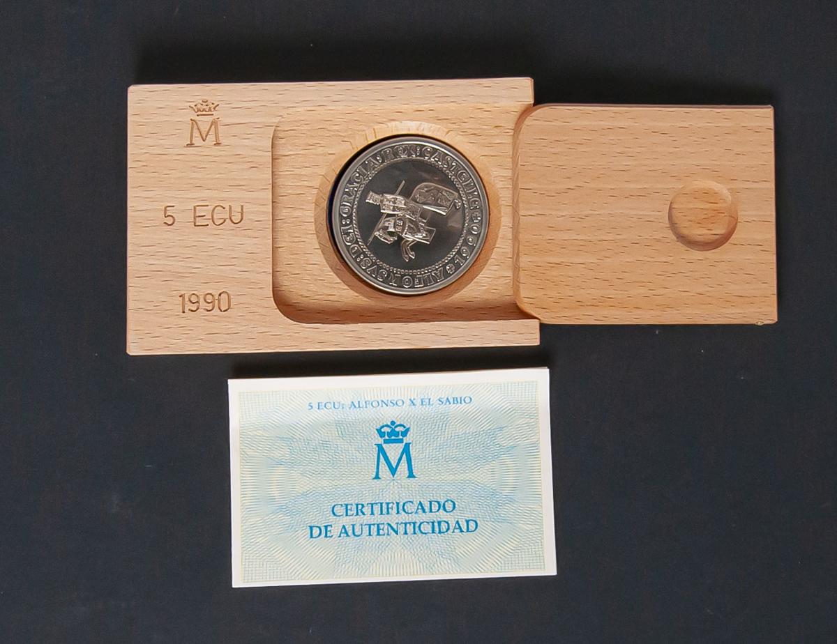 JUAN CARLOS I (1975-2014). 5 Ecu. (Ar. 33,62g/42mm). 1990. FNMT. Alfonso X El Sabio. Flor de cuño. Incluye estuche oficial y certificado de autenticidad. 50.000 acuñaciones.
