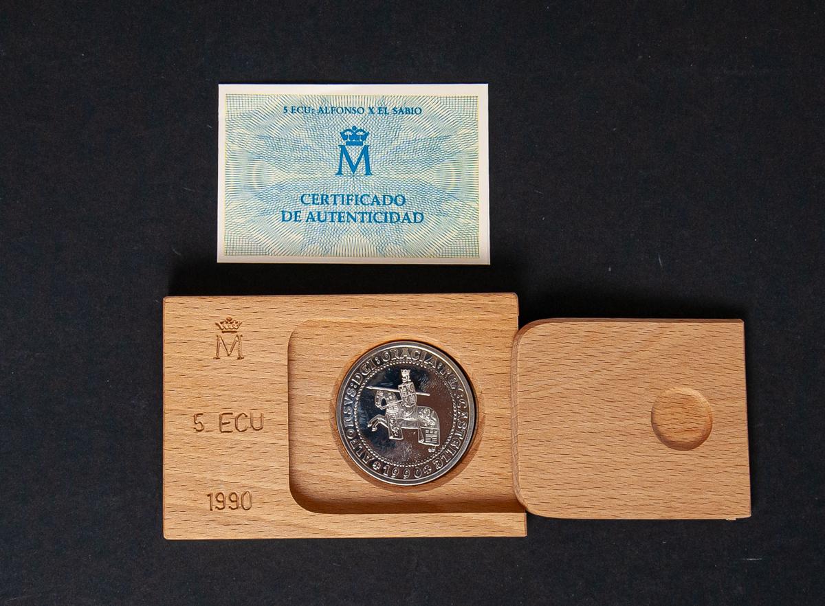JUAN CARLOS I (1975-2014). 5 Ecu. (Ar. 33,62g /42mm). Alfonso X El Sabio. 1990. FDC. 50.000 unidades. Incluye estuche oficial y certificado de autenticidad.