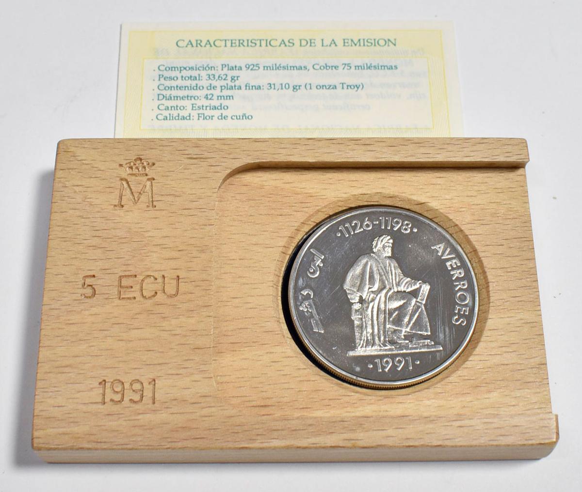 JUAN CARLOS I (1975-2014). 5 Ecu. (Ar. 33,62g/42mm). 1991. FNMT. Averroes. Flor de cuño . 50.000 acuñaciones. Incluye estuche oficial y certificado de autenticidad.