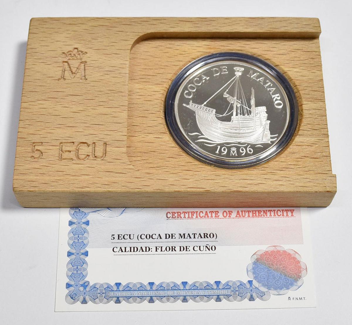 JUAN CARLOS I (1975-2014). 5 Ecu. (Ar. 33,62g/42mm). 1996. FNMT. Coca de Mataró. Flor de cuño . 50.000 acuñaciones. Incluye estuche oficial y certificado de autenticidad.