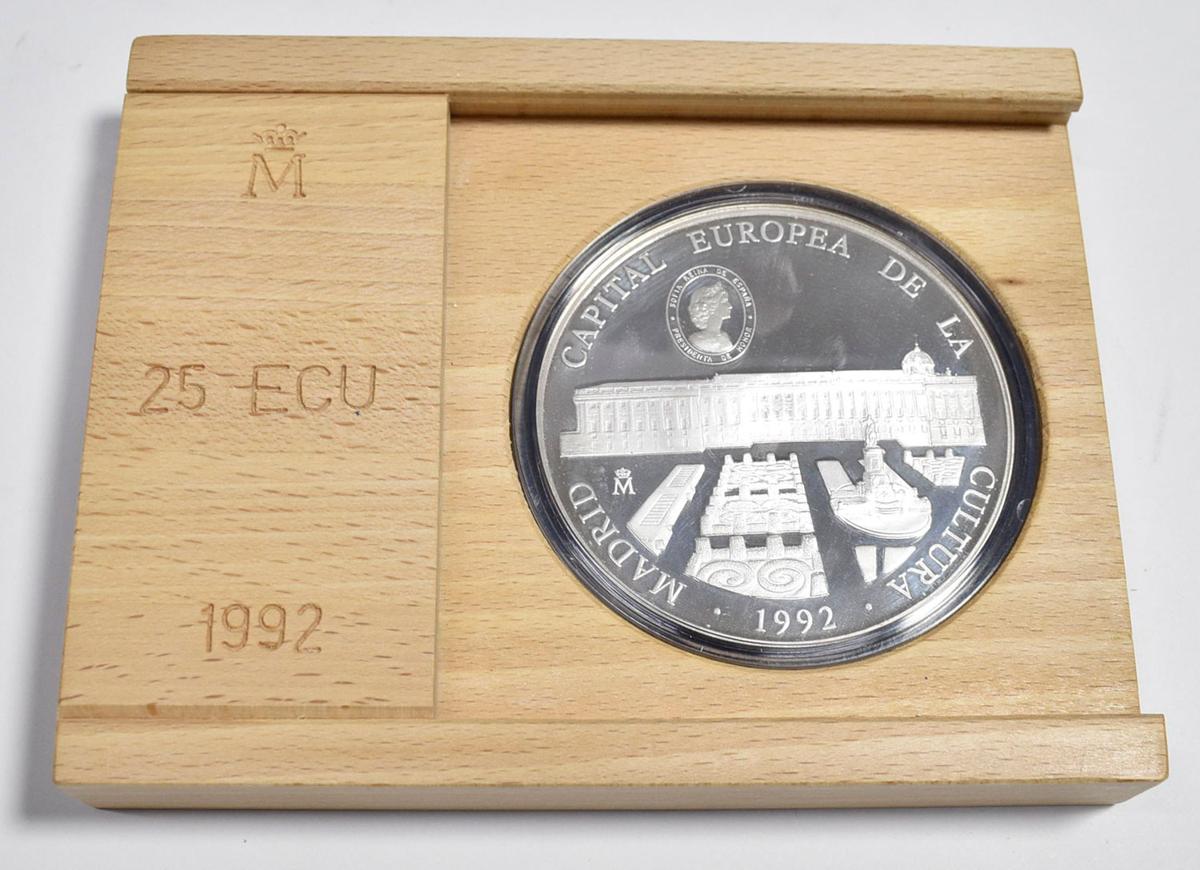 JUAN CARLOS I (1975-2014). 25 Ecu (Ar .168,75g/73mm). 1992. FNMT. Madrid Capital Europea de la Cultura. Flor de cuño. 15.000 acuñaciones. Incluye estuche oficial y certificado de autenticidad
