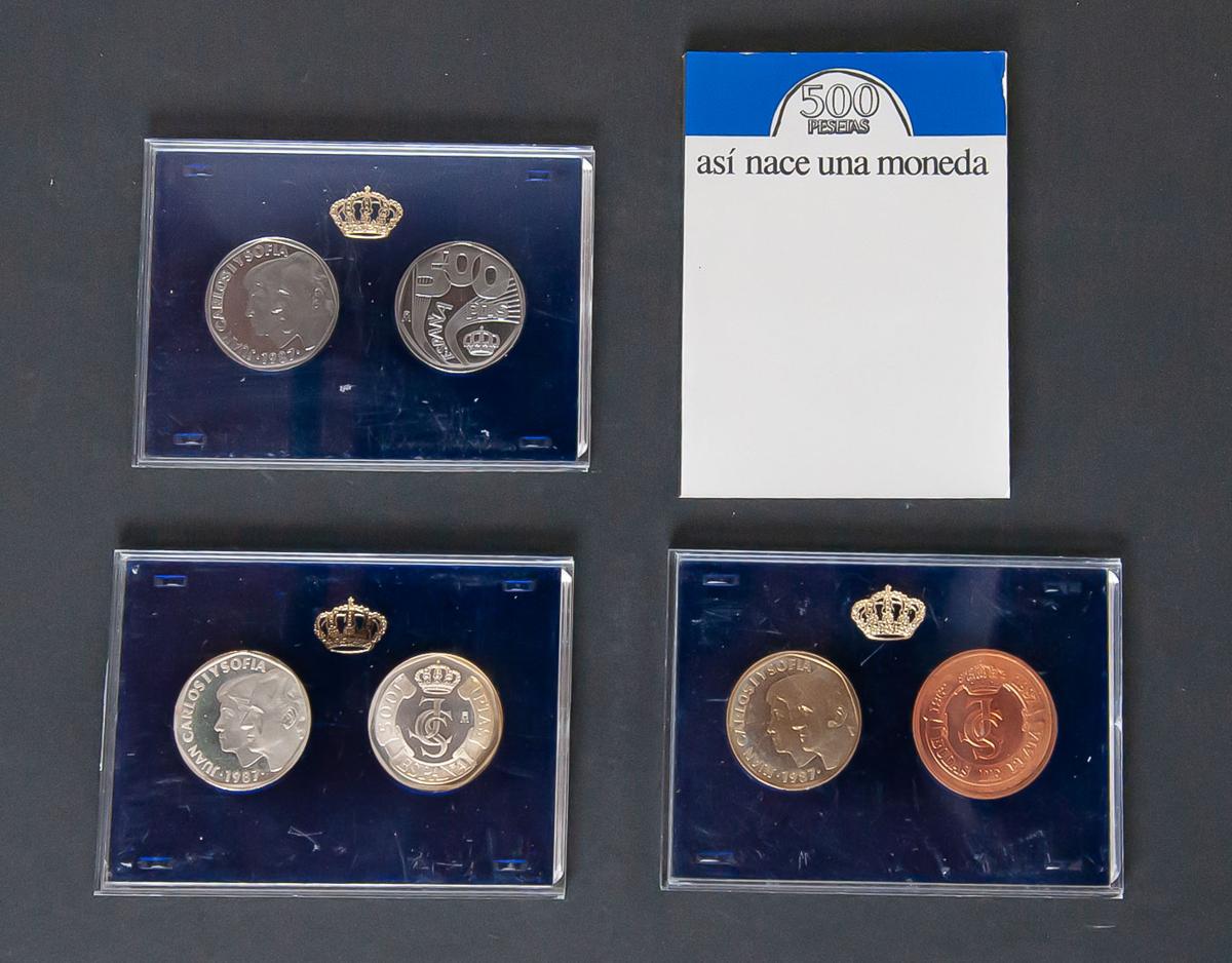 JUAN CARLOS I (1975-2014). 500 Pesetas. Pruebas de la FNMT. Estuche conmemorativo XXV Aniversario de la Boda de los Reyes Juan Carlos I y Sofía. El set incluye 6 monedas y librito "Así nace una moneda". 1987. SC.