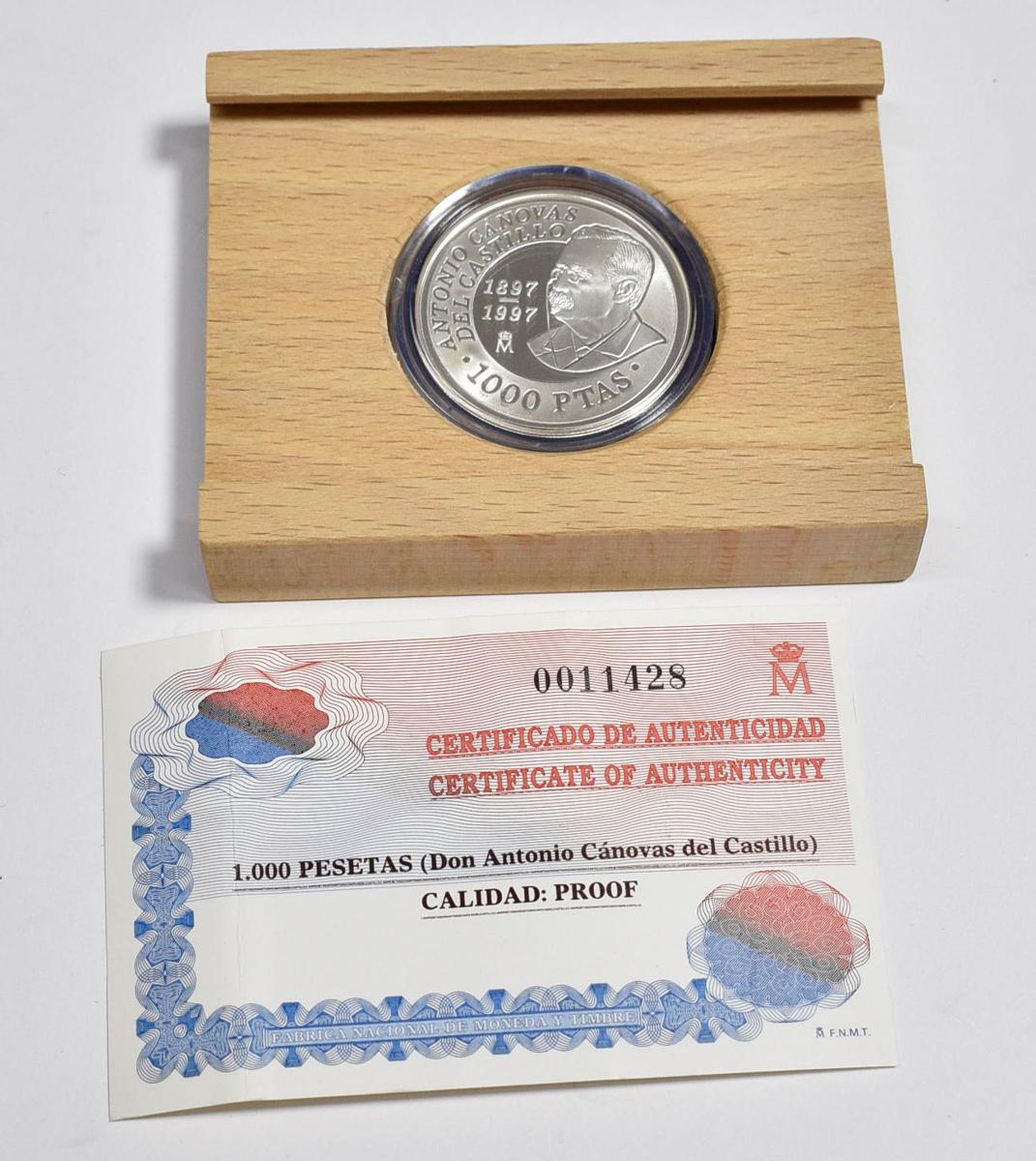 JUAN CARLOS I (1975-2014). 1000 Pesetas (Ar. 13,50g/33mm). 1997. FNMT. Centenario de la muerte de Antonio Cánovas del Castillo. PROOF. Presentada en estuche original con certificado de autenticidad.