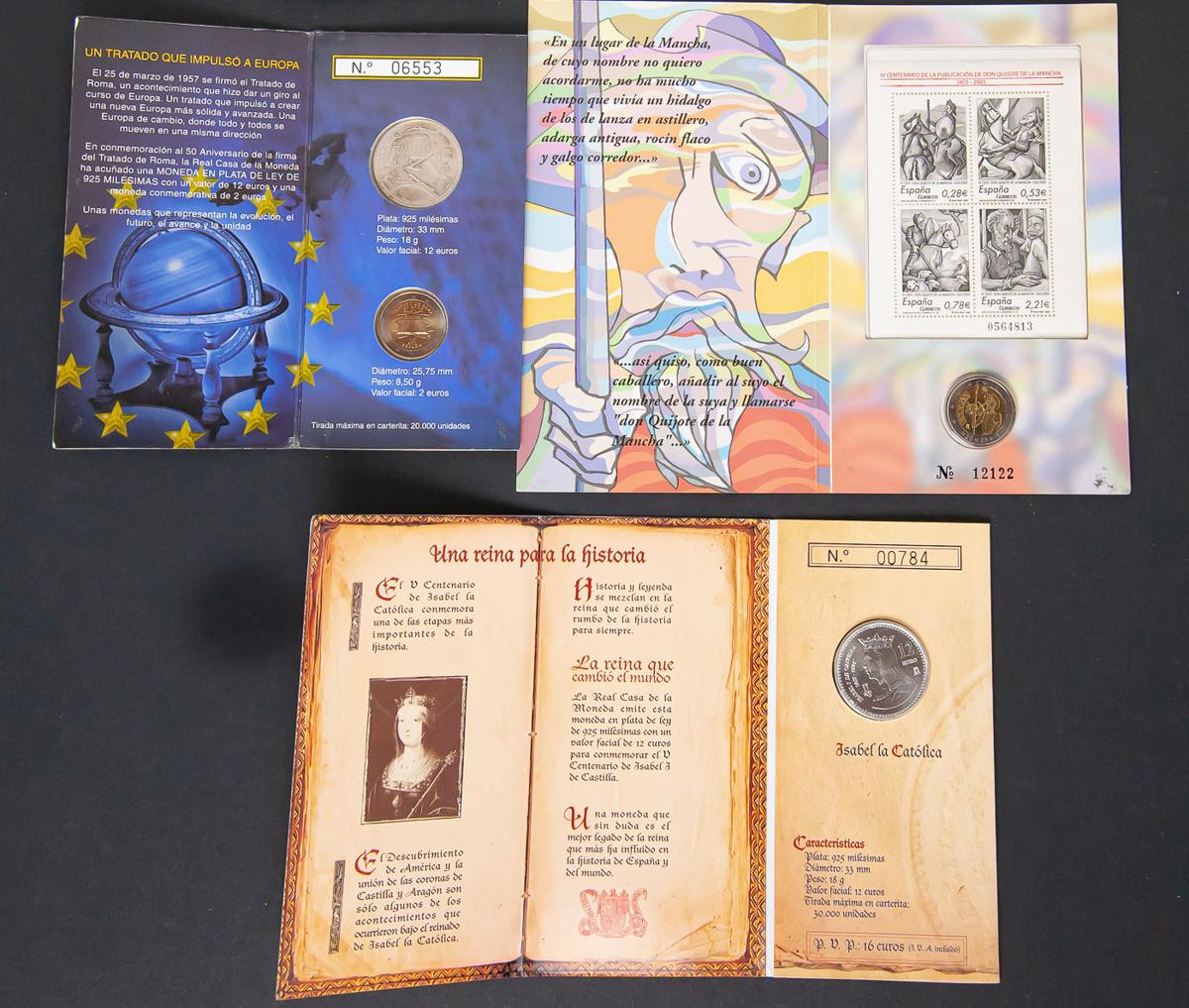 JUAN CARLOS I (1975-2014). Interesante conjunto formado por 4 monedas en estuche y 1 medalla con diferentes valores de Euro y materiales incluyendo la plata destacando dos piezas con valor de 12€. Piezas SC. A EXAMINAR