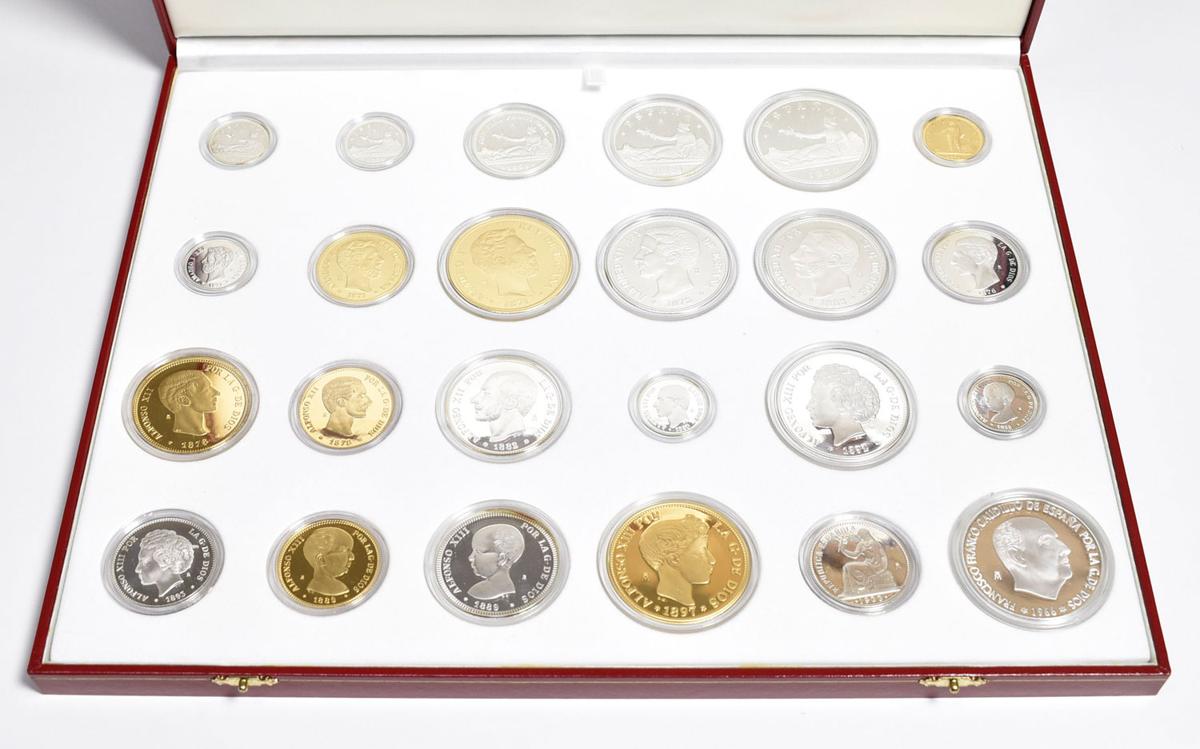 ESPAÑA. Historia de la Peseta. FNMT. Estuche compuesto por 24 réplicas en plata de 0,925 y plata bañada en oro de 24 quilates. Peso total en plata del conjunto 550g. Incluye estuche original, encapsulamiento de cada moneda y certificado de autenticidad. SC.