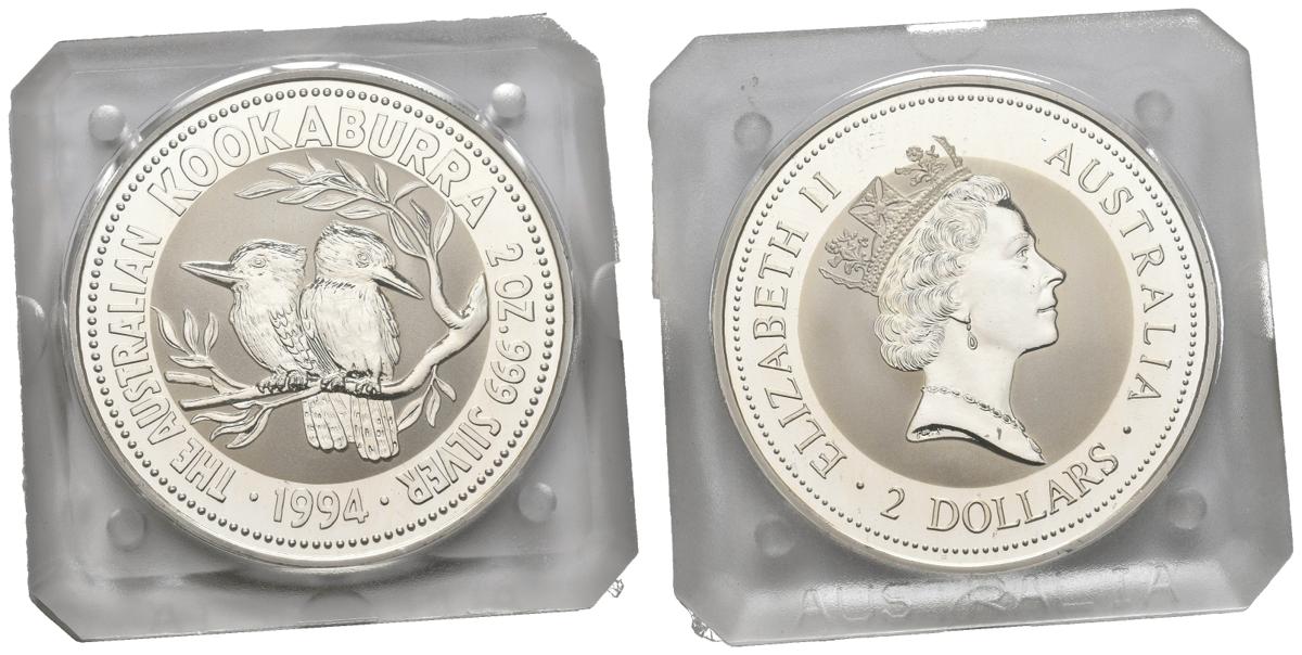 AUSTRALIA. 2 Dollars (Ar. 62,98g/50mm). 1994. Kookaburra. Plata de 0,999 milésimas. (Km#230). PROOF. Incluye cápsula original.