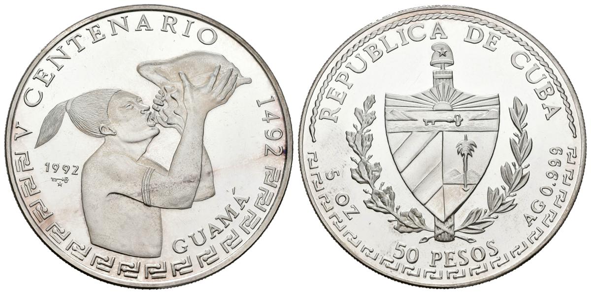 CUBA. 50 Pesos. (Ar. 155,91g/65mm). 1992. V Centenario. Chief Guama. (Km#359). Plata de 0,999 milésimas. SC. Muy escasa sólo 550 acuñaciones.