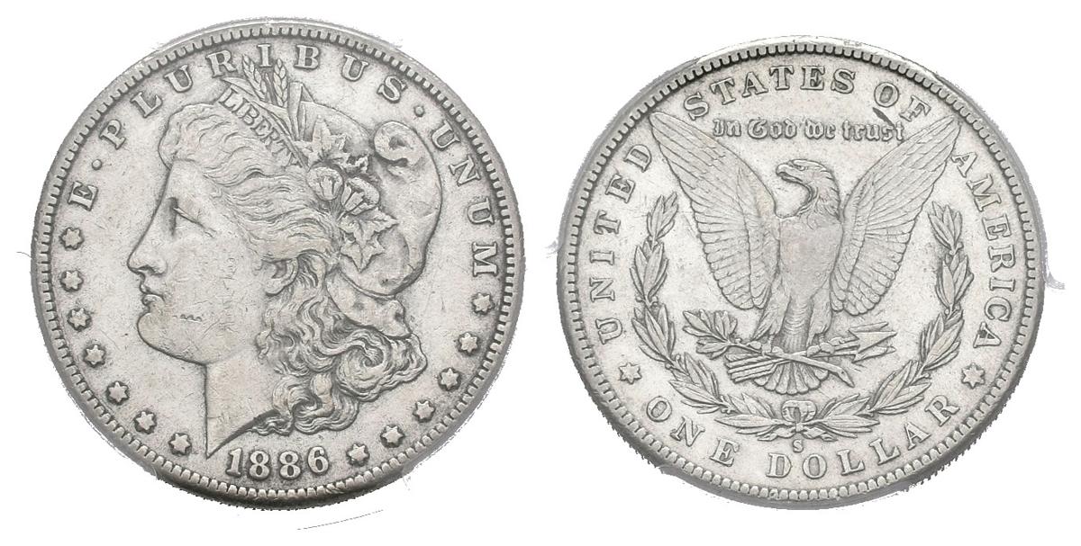 ESTADOS UNIDOS. 1 Dollar (Ar. 26,73g/38mm)*. 1886. San Francisco S. (Km#110). XF 45. Escasa. 750 mil unidades acuñadas. Encapsulado por PCGS. *Peso y medida teórico.