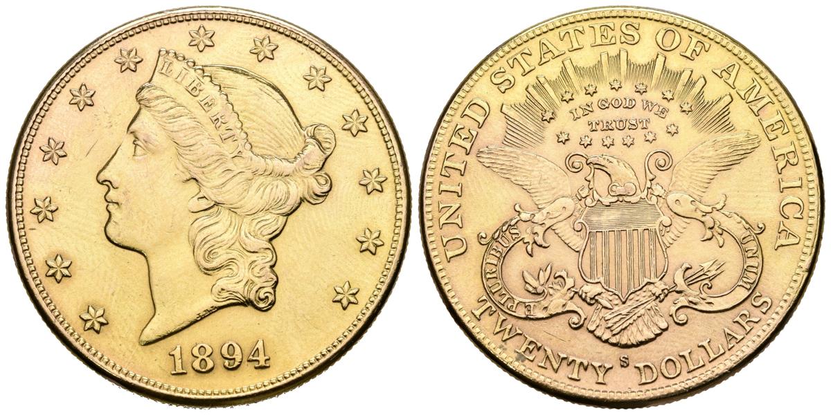 ESTADOS UNIDOS. 20 Dollars. (Au. 33,34g/35mm). 1894. San Francisco S. (Km#74.3). EBC-. Rayas de limpieza.