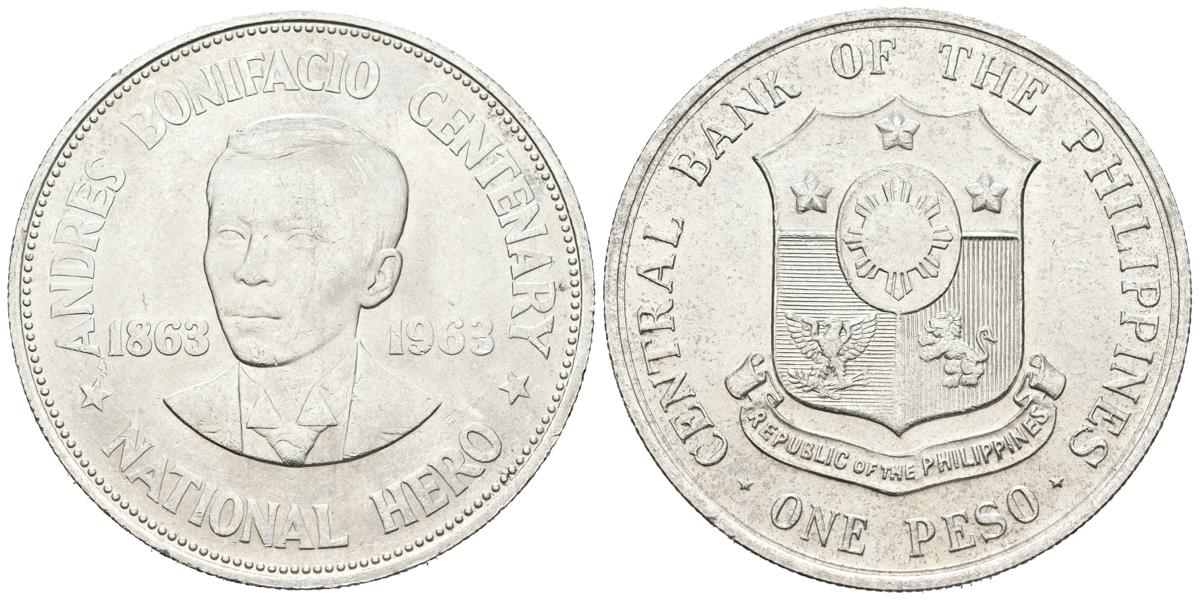 FILIPINAS. 1 Peso (Ar. 26,34g/38mm). 1963. Centenario del nacimiento de Andrés Bonifacio. (Km#193). EBC-. Marquita.