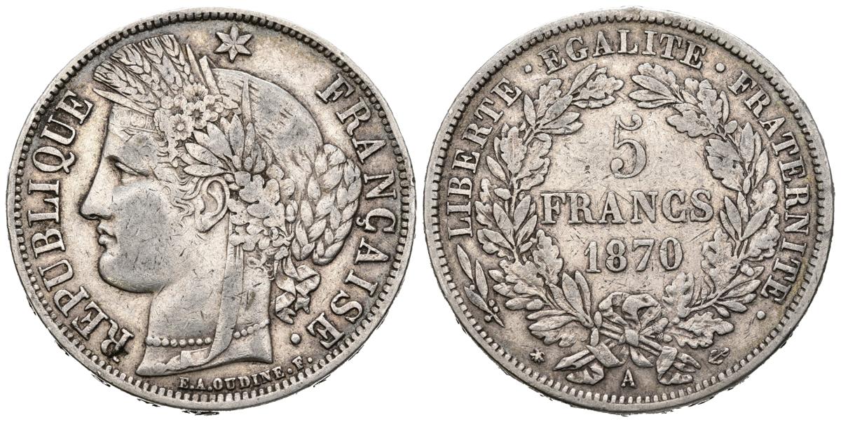 FRANCIA. 5 Francs. (Ar. 24,81g/37mm). 1870. París A. (Km#819). MBC.