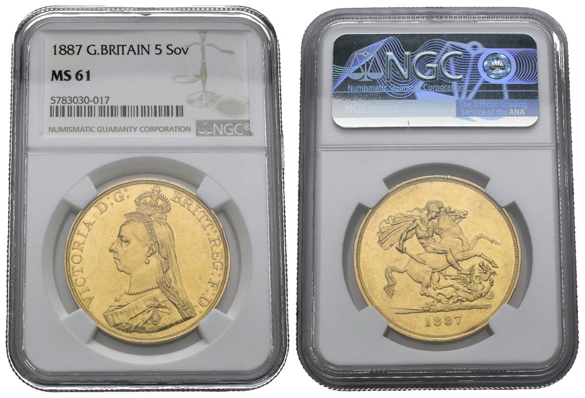 GRAN BRETAÑA. 5 Sovereign. (Au. 39,99g/35m). 1887. (Km#769). MS61. Encapsulado por NGC. Rara en esta calidad.