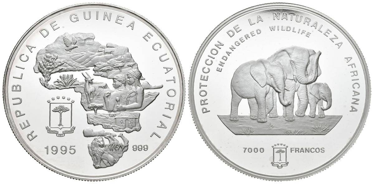 GUINEA ECUATORIAL. 7000 Francos. (Ar. 156,53g/65mm). 1995. Protección de la Naturaleza Africana. (Km#103). Plata de 0,999 milésimas. PROOF. Tirada de sólo 555 unidades.