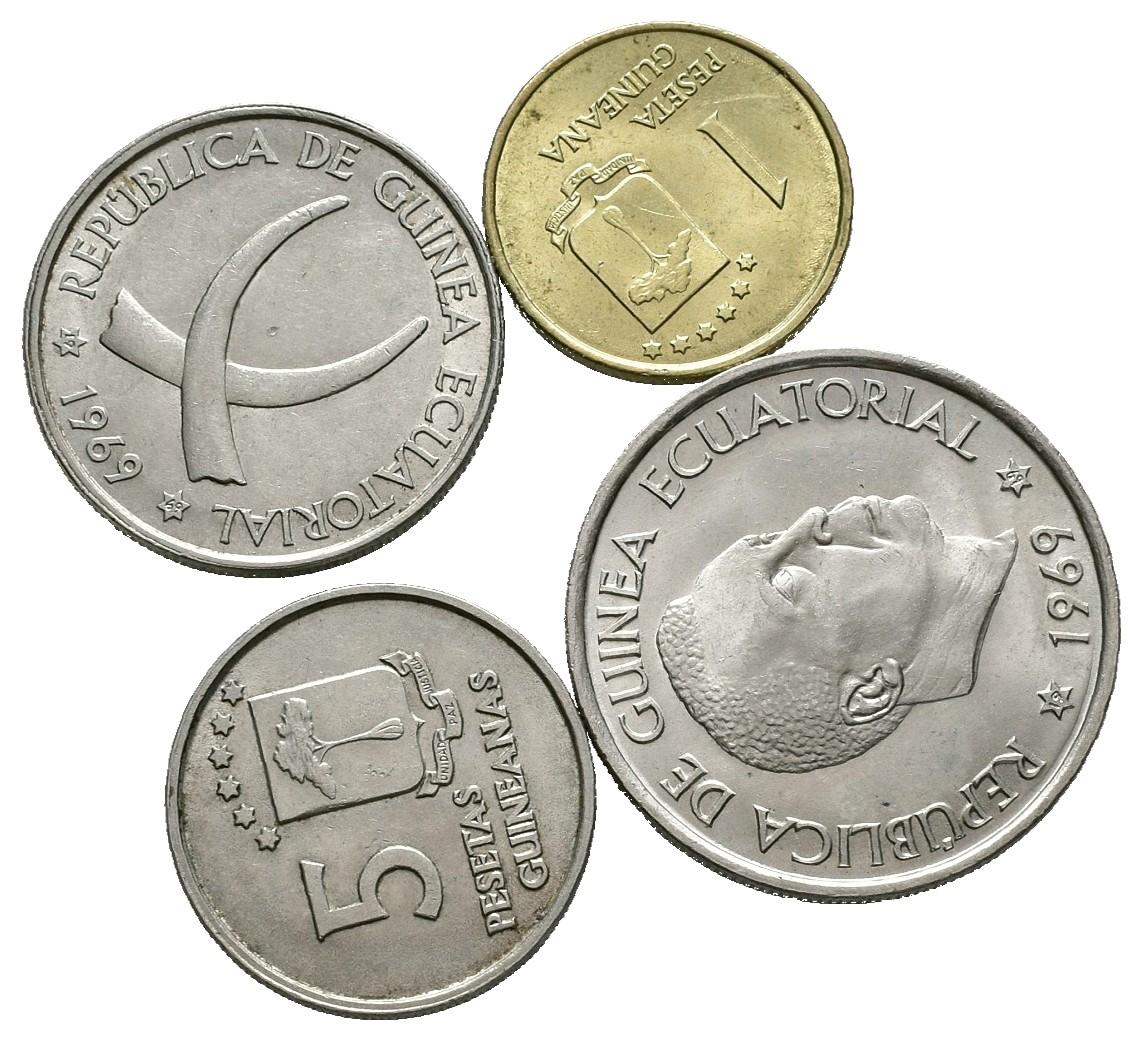 GUINEA ECUATORIAL Bonito conjunto formado por 4 monedas de 1, 5, 25 y 50 Pesetas Guineanas. 1969. Alto grado de conservación general. A EXAMINAR.