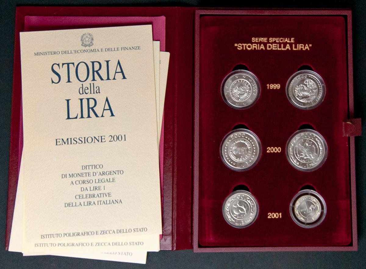 ITALIA. Serie de la Historia de la Lira compuesta por 6 monedas conmemorativas en plata de este módulo y acuñadas en los años 1999, 2000 y 2001. Incluye estuche original y certificado de autenticidad. PROOF.
