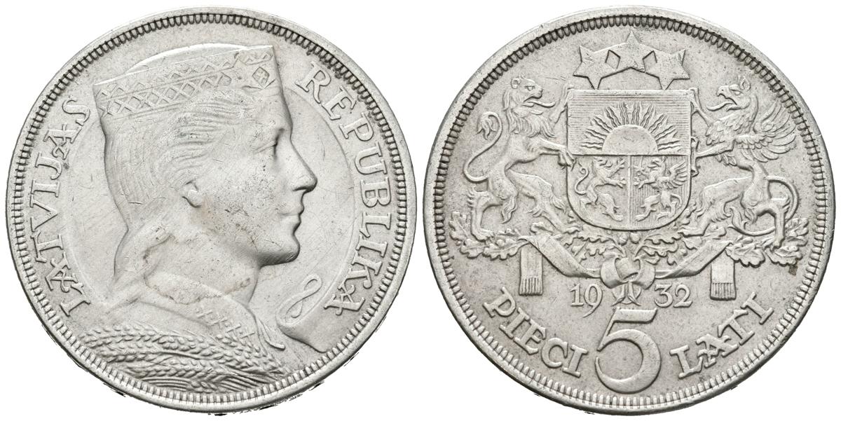 LETONIA. 5 Lati. (Ar. 24,97g/37mm). 1932. 1ª República (1918-1940). (Km#9). MBC+. Rayitas de limpieza.