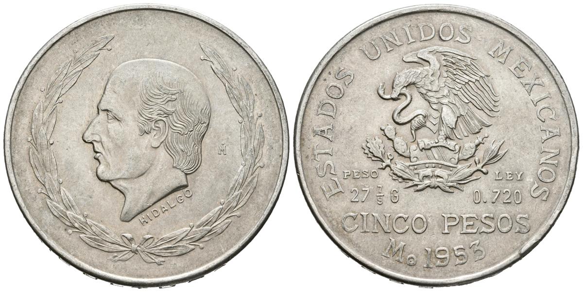 MÉXICO. 5 pesos. (Ar. 27,69g /39mm). 1953. Año de Hidalgo. (Km#467). EBC-. Golpe en el canto