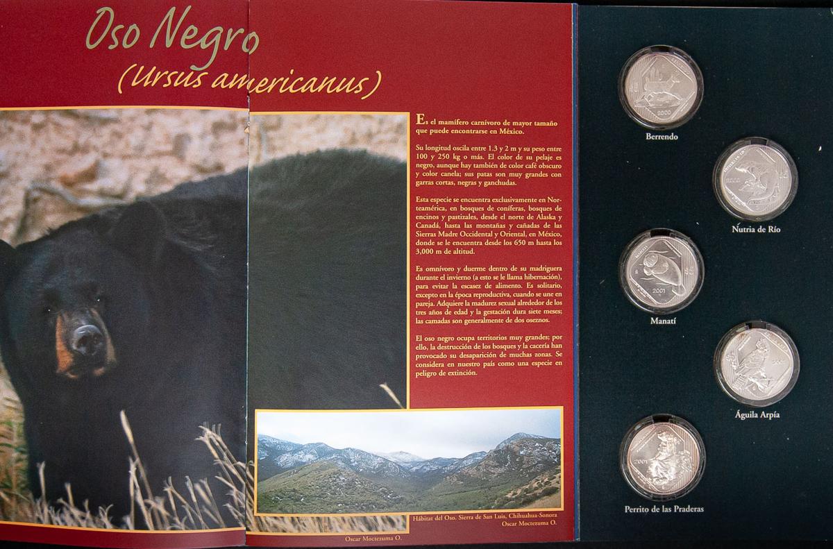 MÉXICO. Monedas y Especies. Edición limitada de 10 monedas de 1 onza de plata pura. Animales en peligro de extinción. 2000 Y 2001. Banco de México. Presentado en álbum original. SC.