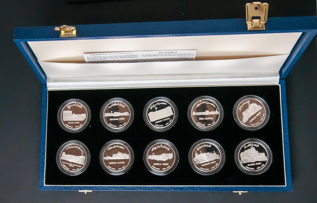 OMAN. Estuche compuesto por 10 monedas de 1 Rial de plata dedicadas a Castillos y Fortificaciones. 1995. Royal Mint británica. Plata de 0,925 milésimas. Incluye estuche original del Banco Central de Omán y certificado de autenticidad. SC.