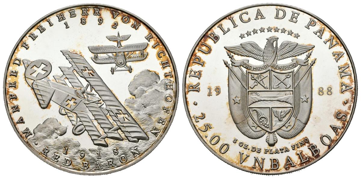 PANAMA. 25 Balboas (Ar. 155,58g/64mm). 1988. 75 Aniversario de la muerte de Manfred Freiherr Von Richthofen "Barón Rojo". (Km#X14). Plata de 0,999 milésimas. PROOF.