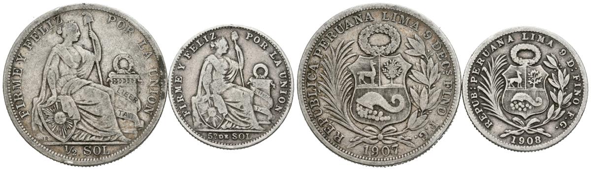 PERÚ. Conjunto de 2 monedas de 1/5 y 1/2 de Sol acuñados en 1907 y 1908. Diferentes estados de conservación. A EXAMINAR