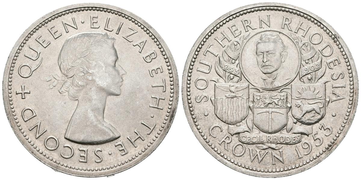 RODESIA DEL SUR. 1 Crown (Ar. 28,25g/39mm). 1953.Centenario del nacimiento de Cecil Rhodes. (Km#27). EBC.