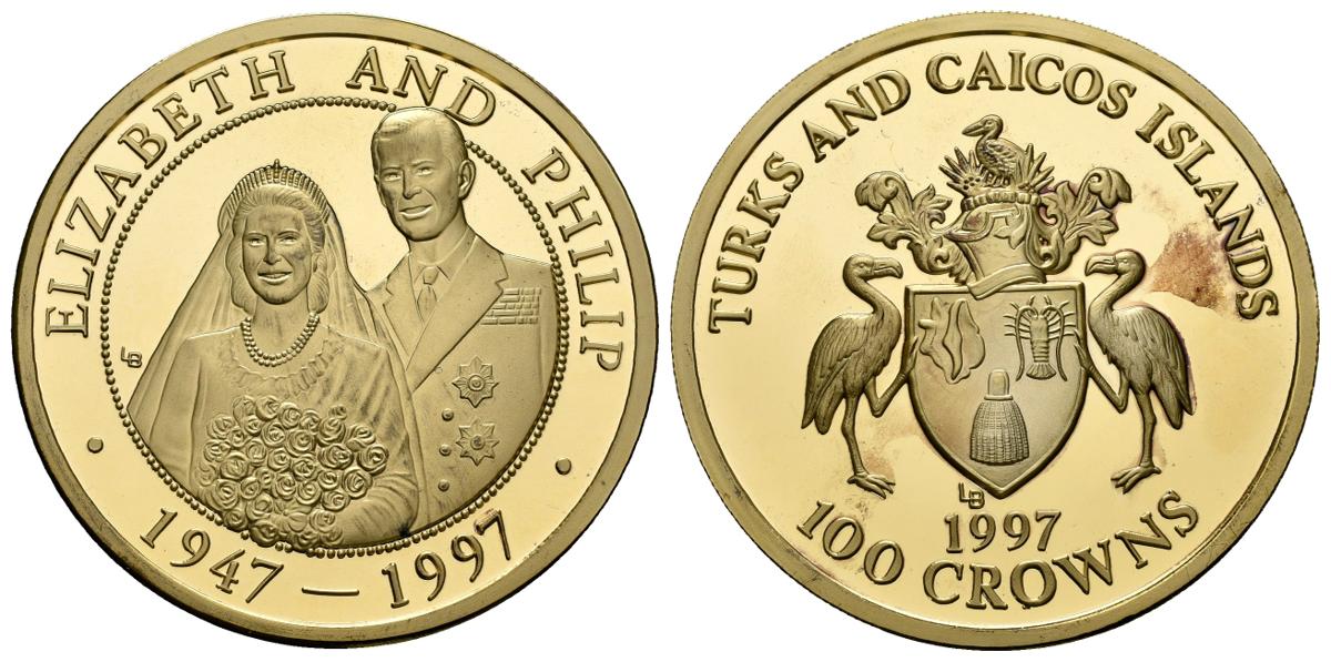 TURKS Y CAICOS. 100 Crowns. (Ar-dorada.156,85g/63mm). 1997. 50 Aniversario de la boda real entre Isabel II y Felipe. (Km#237). Plata de 0,999 milésimas. PROOF.