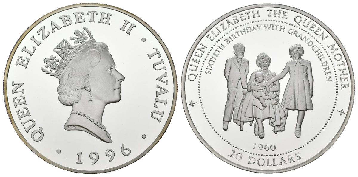TUVALU. 20 Dollars. (Ar. 156,70g/65mm). 1996. Queen Elizabeth The Queen Mother. (Km#39). Plata de 0,999 milésimas. PROOF. Sólo 3000 unidades acuñadas. Incluye certificado de autenticidad.