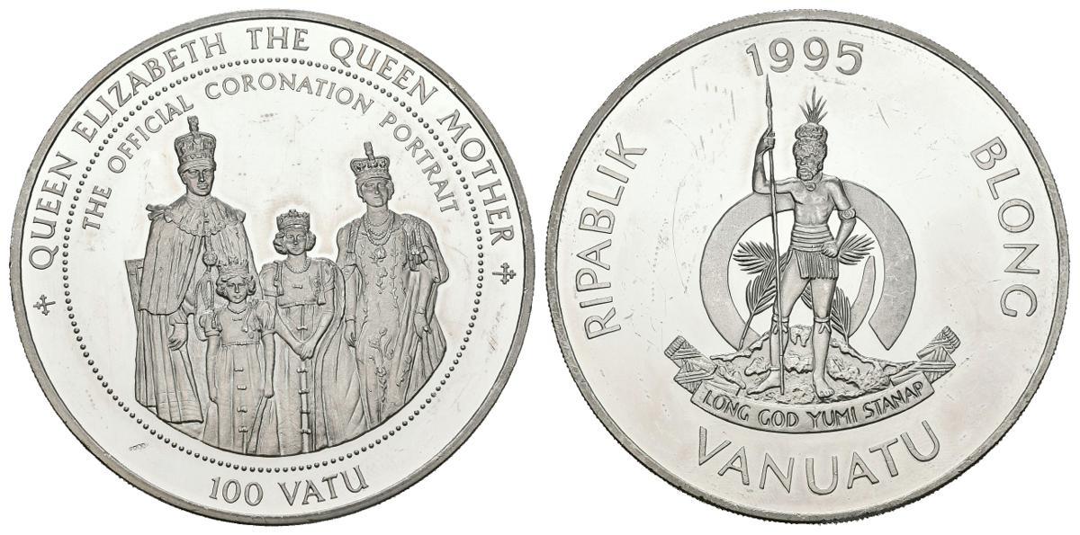 VANUATU. 100 Vatu. (Ar. 156,41g/65mm). 1995. Coronación de la Reina. (Km#27). Plata de 0,925 milésimas. PROOF. Rayitas. Sólo 2000 unidades.