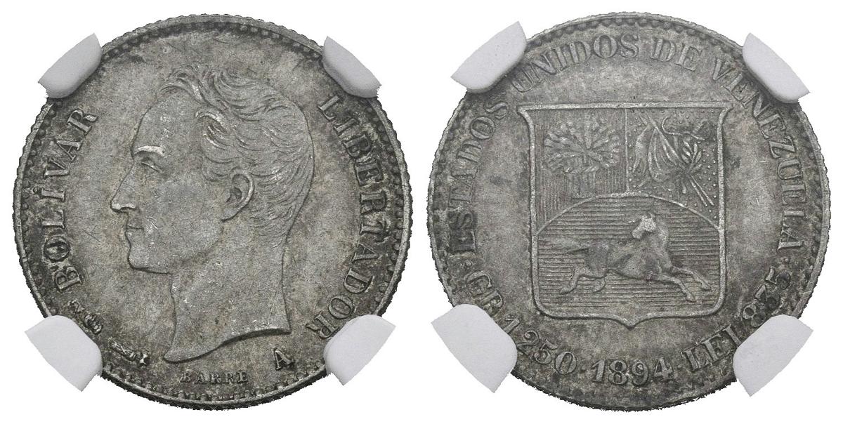 ESTADOS UNIDOS DE VENEZUELA. 1/4 Bolívar. (Ar. 1,25g/15mm). 1894. París A. (Km#Y20). Encapsulado NGC AU-55.