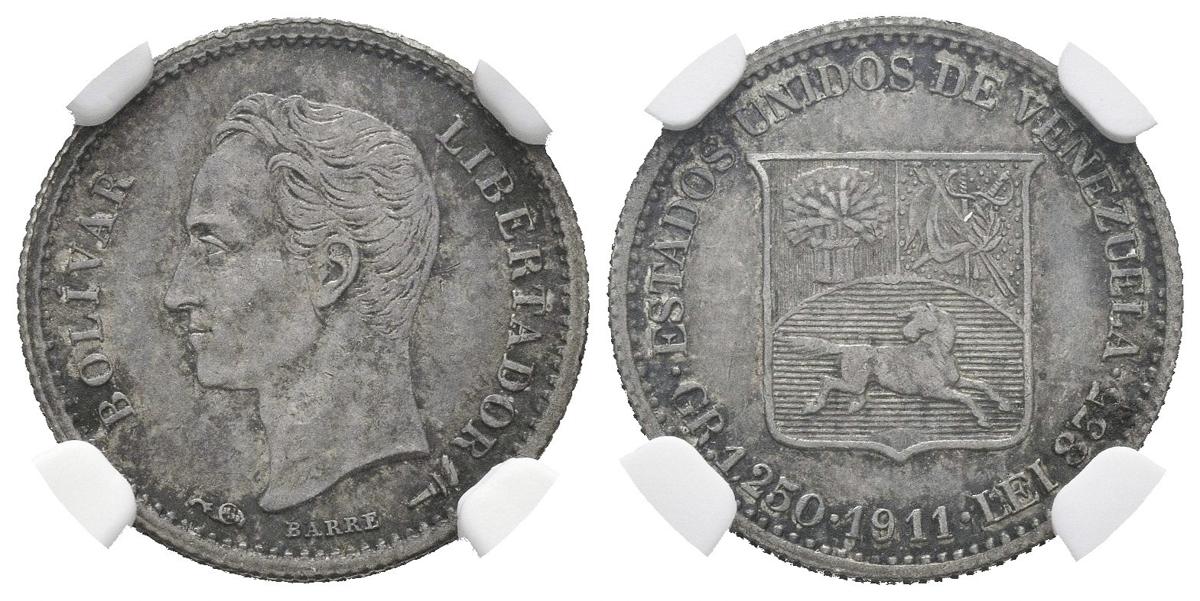 ESTADOS UNIDOS DE VENEZUELA. 1/4 de Bolívar. (Ar. 1,25g/15mm). 1911. (Km#Y20). Encapsulado NGC AU-55.