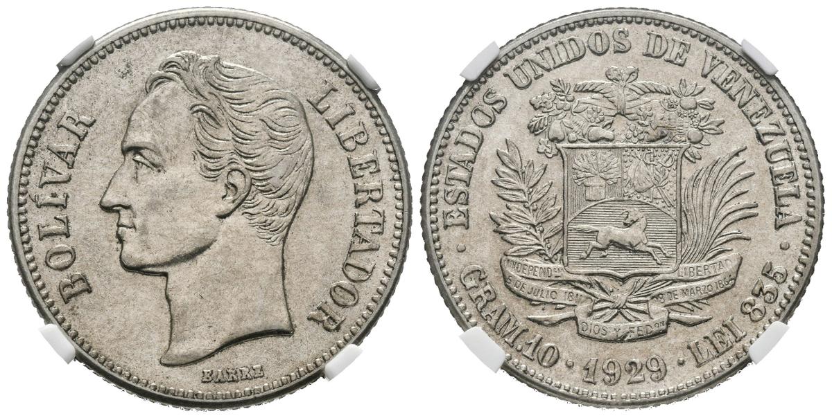 ESTADOS UNIDOS DE VENEZUELA. 2 Bolívares. (Ar. 10,00g/27mm). 1929. Philadelphia. (Km#Y23). Encapsulado NGC AU-58.
