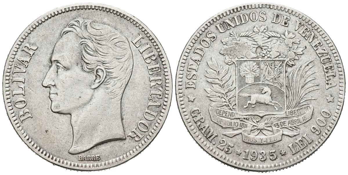 VENEZUELA. 5 Bolívares. (Ar. 24,83g/37mm). 1935. Philadelphia. (Km#Y24.2). MBC.