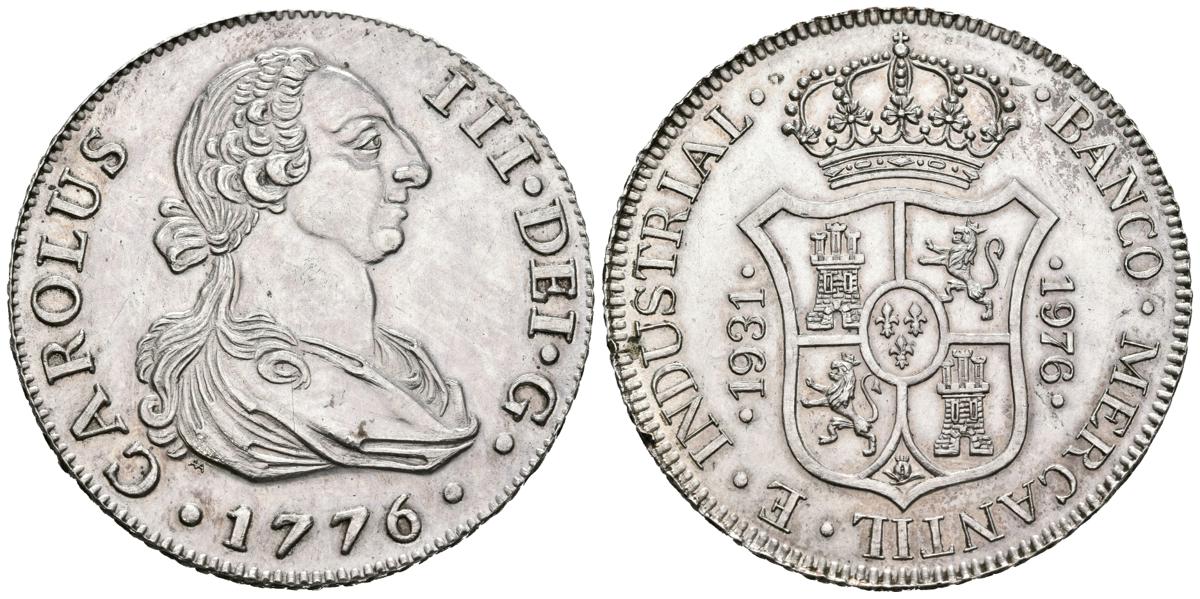 JUAN CARLOS I (1975-2014). Banco Mercantil Industrial 1931-1976 (Ar. 26,34g/40mm). 1976. Imitación de los 8 Reales de Carlos III. EBC.